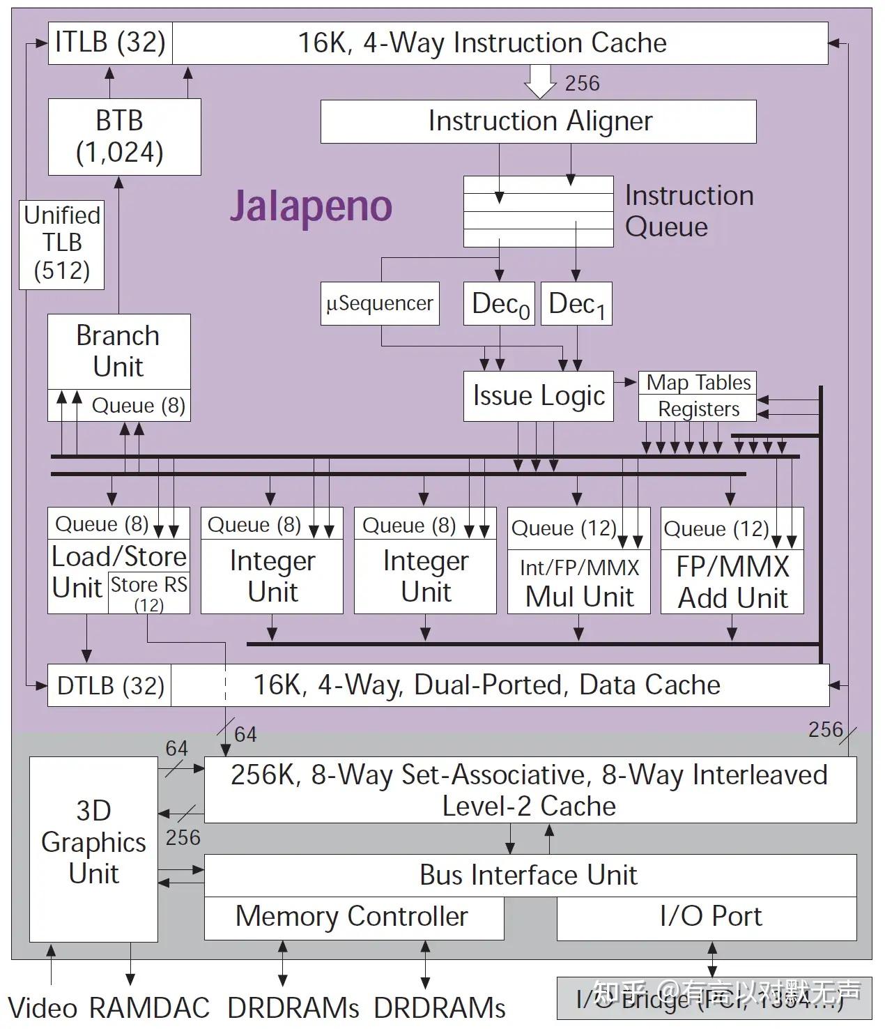 - 缓存层次结构大,64K L1指令和数据缓存,1MB L2缓存,有数据预取缓存。